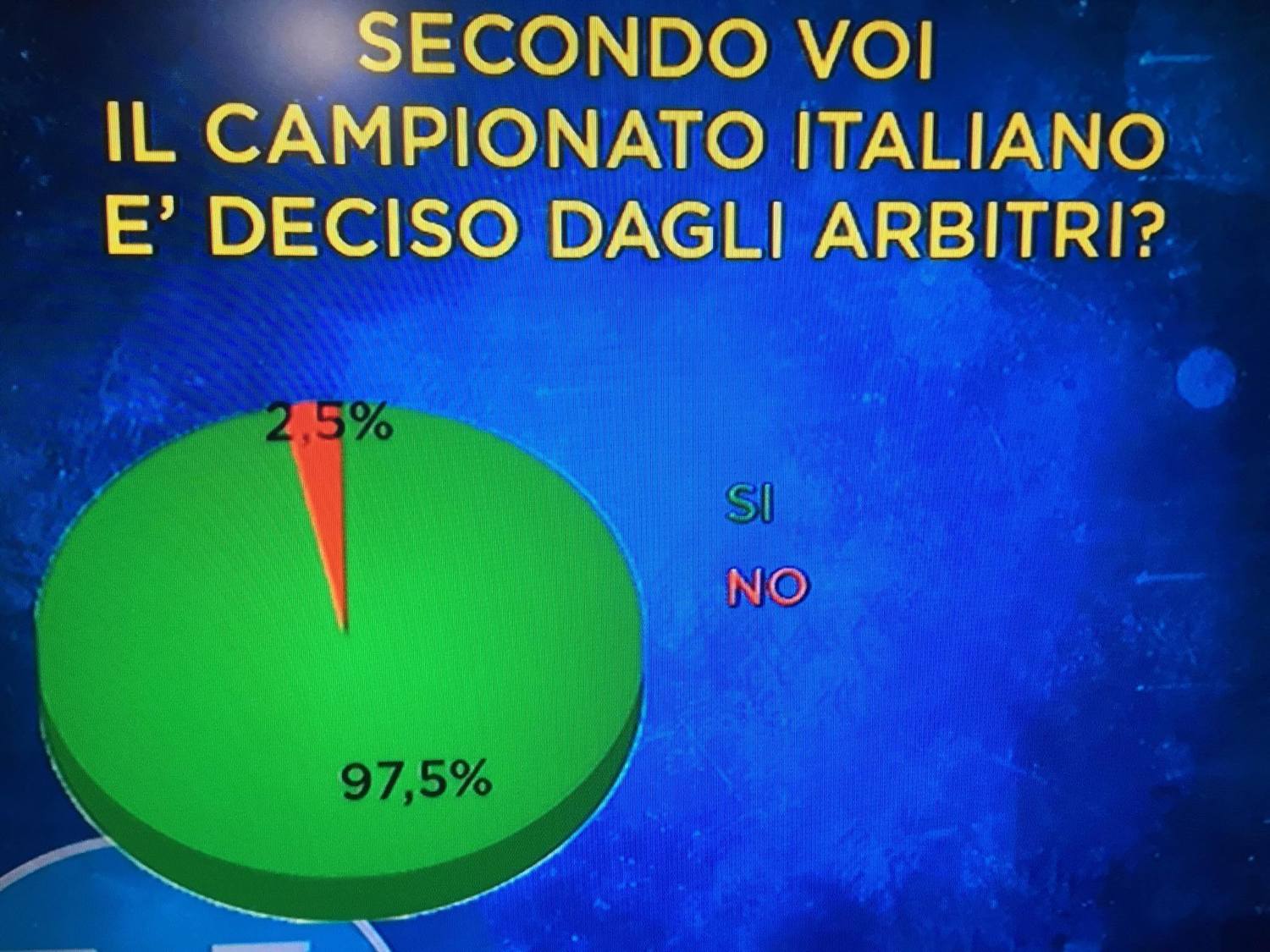 Ci sono sondaggi che richiamo il consenso popolare, in alcuni casi anche in maniera schiacciante. E' successo per quanto riguarda gli arbitri e la loro influenza sul campionato italiano. Questo il sondaggio lanciato durante la trasmissione "Il bello del calcio" su Canale 21. Alla domanda riguardante una possibile influenza degli arbitri italiani, la risposta è stata quasi unanime verso il 'si'.