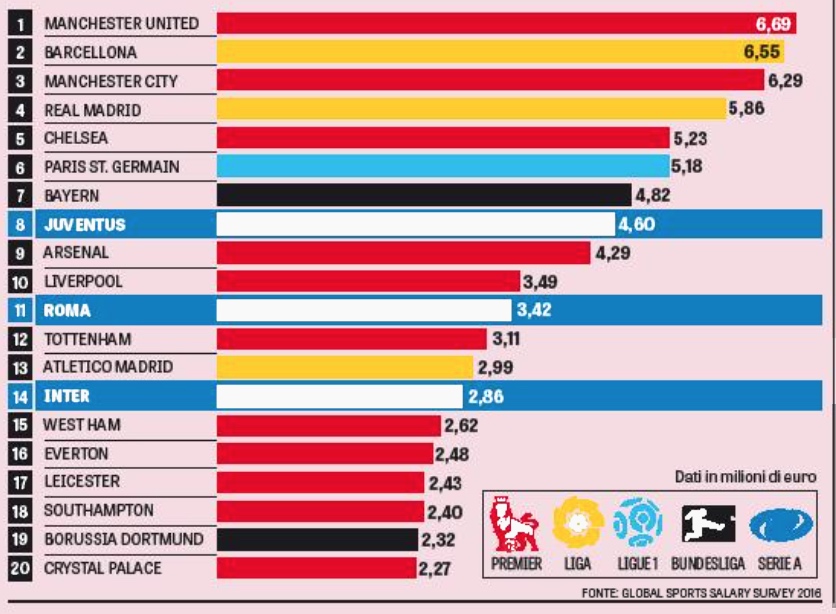 La Gazzetta dello Sport di questa mattina riporta una classifica interessante che riguarda gli stipendi medi delle squadre di calcio in Europa. Al primo posto c'è il Manchester United con 6,69 milioni di media, secondo il Barcellona con 6,55, mentre terzo risulta il Manchester City con 6,29 milioni. Il Real Madrid è al quarto posto, il PSG al sesto mentre il Bayern Monaco figura al settimo posto. Prima italiana in classifica è la Juventus che si piazza all'ottavo posto con 4,6 milioni di euro di media. La seconda italiana è, a sorpresa, la Roma, che figura all'11° posto, subito fuori dalla top ten, con 3,42 milioni. La terza italiana, e ultima presente nella top 20, è l'Inter al 14° con 2,86 milioni.