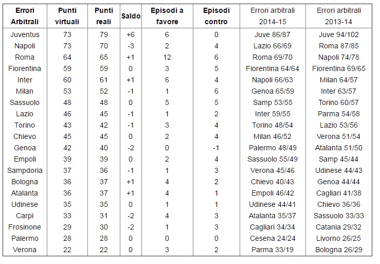 Il portale Superscommesse.it propone un'attenta analisi delle sviste arbitrali in Serie A, con la Juventus che risulterebbe nettamente favorita: i bianconeri, infatti, vantano ben 6 episodi a favore e nessuno contro, a differenza nel Napoli che ne conta 4 contro e nessuno a favore. Il bilancio, in termini di punti, porterebbe addirittura a pareggiare la posizione in classifica di entrambe le squadre, che come punteggio "virtuale" (al netto, quindi, degli errori arbitrali) vantano 73 punti.