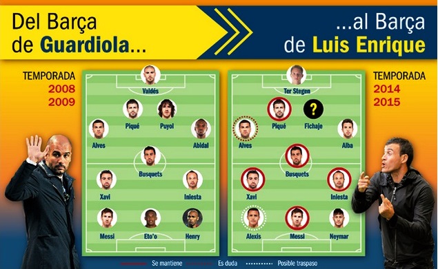 Sull'edizione odierna del quotidiano spagnolo Sport.es è apparso un grafico con la formazione tipo del Barcellona di Pep Guardiola e quella probabile del prossimo anno del nuovo tecnico Luis Enrique. Nelle idee dell'ex allenatore della Roma non c'è Javier Mascherano. Inamovibili i tre a centrocampo mentre in difesa si interverrà per un acquisto di livello da affiancare a Pique. Ulteriore indizio alla sua prossima cessione.