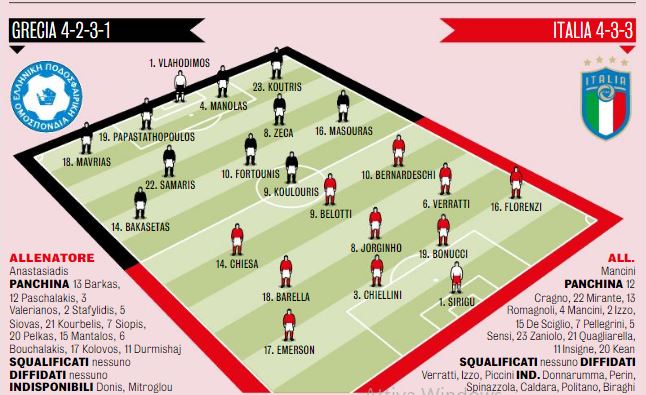 GRAFICO Gazzetta - Grecia-Italia, probabili formazioni: out Insigne, Mancini preferisce Belotti