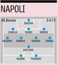 La rosea propone come formazione tipo per il Napoli un 3-4-1-2 con Casella, Manzi e Senese davanti al portiere Idasiak. Mezzoni e Zanoli sugli esterni con Mamas e Vrakas in mediana. Gaetano il trequartista alle spalle di Sgarbi e Palmieri.