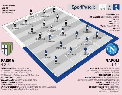 Carlo Ancelotti è tornato ieri nella sua Parma e ha ancora qualche ora per sciogliere i dubbi di formazione. Dovrà fare a meno di Lorenzo Insigne (squalificato) e medita se schierare al fianco del polacco Milik, Mertens - ancora a secco di gol nel 2019 - oppure l’emergente Ounas, reduce dall’ottima prova in Europa League. A centrocampo tornano gli spagnoli Callejon e Fabian Ruiz, insieme ad Allan e Zielinski. Qualche dubbio in difesa con Ghoulam - ancora non al meglio, dopo un anno di stop - che potrebbe lasciare la corsia di sinistra a Hysaj, mentre a destra dovrebbe giocare il francese Malcuit, in buono stato di forma. Di seguito il grafico de La Gazzetta dello Sport: