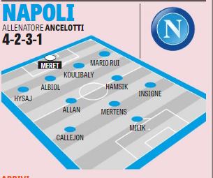 L'edizione odierna de La Gazzetta dello Sport ha schierato una probabile formazione del Napoli attuale, considerando gli imminenti arrivi di Fabian Ruiz, Alex Meret e Orestis Karnezis. Ciò che salta all'occhio è la presenza di uno solo dei quattro acquisti già messi a segno: c'è solo Meret tra i pali, poi in questo undici tipo, messo in campo con un 4-2-3-1, out lo stesso Fabian Ruiz, ma anche Simone Verdi. Di seguito la formazione della Rosea: