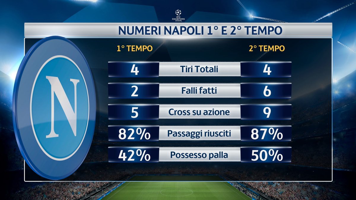 Interessante grafico mostrato da Premium Sport sulla differenza di rendimento del Napoli tra il primo e il secondo tempo della sfida al City: migliorano i cross su azione, i passaggi riusciti e il possesso palla, salito al 50% con la squadra di Guardiola.