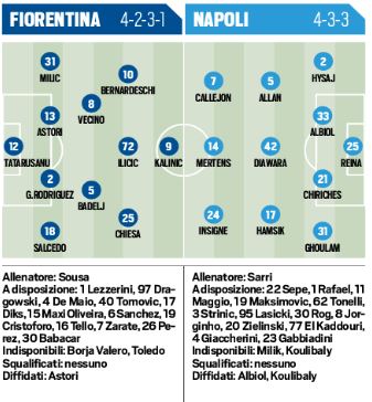 Saranno pochi i cambi di Maurizio Sarri per la trasferta di Firenze. Il tecnico azzurro si affiderà ancora a Mertens in avanti, malgrado Gabbiadini abbia smaltito l'influenza e figuri tra i convocati. In difesa tutto confermato, con Maksimovic ancora in panchina, mentre a centrocampo torneranno Diawara ed Allan, con Jorginho e Zielinski out. Ecco il grafico di formazione di Tuttosport: