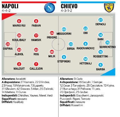 Uno in difesa, un altro a centrocampo e l'ultimo in attacco. Dovrebbero essere tre i cambi di Carlo Ancelotti per il match contro il Chievo, stando a quanto confermato da Tuttosport. Malcuit in difesa per Hysaj, Rog in mediana per Allan e Milik in attacco per Mertens. Ma ci sono anche altri ballottaggi da tenere in considerazione. Il quotidiano piemontese schiera così le due formazioni nel suo grafico:
