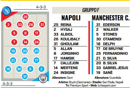 L'edizione odierna di Tuttosport prova ad anticipare le scelte di Sarri e Guardiola per il match di domani tra Napoli e City: il tecnico degli azzurri è pronto a confermare tutti i titolarissimi, mentre l'allenatore spagnolo punta su Gabriel Jesus per l'attacco insieme a Sanè e Silva.