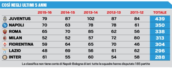 L'edizione odierna di Tuttosport propone una speciale classifica, che tiene conto dei punti raccolti dalle squadre di Serie A nelle ultime cinque stagioni: dietro la Juventus, irragiungibile con i suoi 439 punti, c'è solo il Napoli a quota 350, con 12 lunghezze di vantaggio sulla Roma terza. Un dato che inorgoglisce ancor di più i torinesi: "Il dislivello col Napoli è di 89 punti. Vale a dire, in sostanza, una quota tricolore [...] in cinque anni la Juventus ha raggranellato insieme i punti sufficienti per vincere sei scudetti".