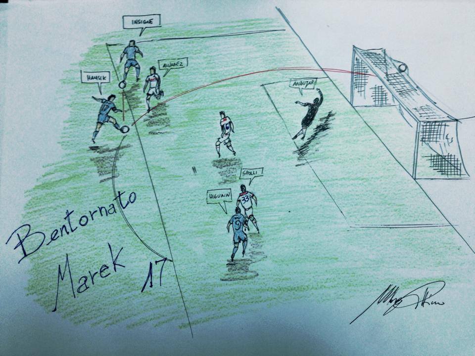 Le due reti che superano il catania TuttoNapoli ve le presenta nei disegni firmati da Marco Bottino. I due gol sapientemente disegnati sono le rappresentazioni fedeli delle due reti degli azzurri che hanno steso il catania al San Paolo. Nella prima vignetta il gol di Callejon poi la rete di Hamsik su assist di Insigne. Tutte le vignette di Marco Bottino le ritrovate sulla pagina facebook della trasmissione Club Napoli Allnews in onda tutti i giorni dalle 15:30 alle 19:30 su TeleclubItalia Canale 98 del digitale terrestre in Campania e in streaming sul sito dedicato www.clubnapolinews.it