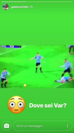 Gaia Lucariello, futura moglie del tecnico dei biancocelesti Simone Inzaghi, dopo la partita ha postato un'immagine del contatto in area di rigore tra Benatia e Lucas Leiva non punito da Banti: "Dove sei VAR?", si chiede Lady Inzaghi su Instagram. E se lo chiedono in tanti...