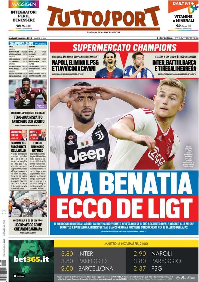 "Napoli, elimina il PSG e ti avvicini a Cavani!". Tuttosport carica così il Napoli per il match di stasera contro il PSG, parlando di una doppia missione per Ancelotti nel taglio alto della sua prima pagina. "Supermercato Champions", si legge. In primo piano il mercato della Juventus: "Via Benatia, ecco de Ligt".