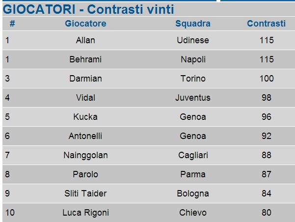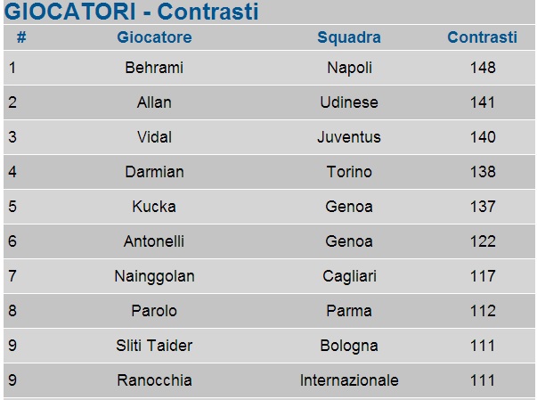 Al momento del suo acquisto molti non sembravano convintissimi, ma Valon Behrami sul campo s'è conquistato un ruolo di primo piano nel Napoli diventando addirittura nell'ultimo periodo tra i giocatori più amati dal San Paolo che spesso gli ha tribuato la standing ovation. L'impatto in maglia azzurra è stato devastante e la combattività dello svizzero la possiamo riscontrare anche nei numeri. Behrami è al primo posto, insieme ad Allan dell'Udinese, per numero di contrasti vinti. Addirittura 115! Staccatissimi giocatori come Vidal e Nainggolan. Il distacco aumenta ulteriormente nella classifica dei contrasti totali (148!)