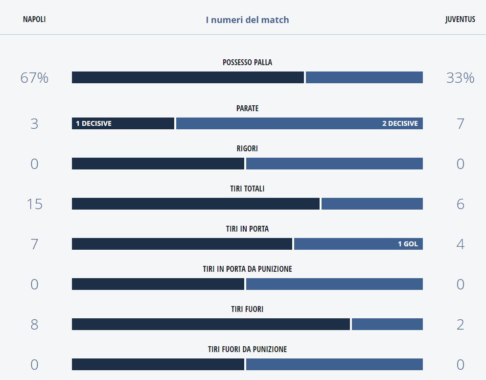 Napoli che perde al San Paolo per mano della Juve di Allegri, ma che al contempo asfalta i bianconeri nelle statiche: 67% di possesso palla per gli azzurri e ben 15 tiri a dispetto dei 6 realizzati dagli avversari.