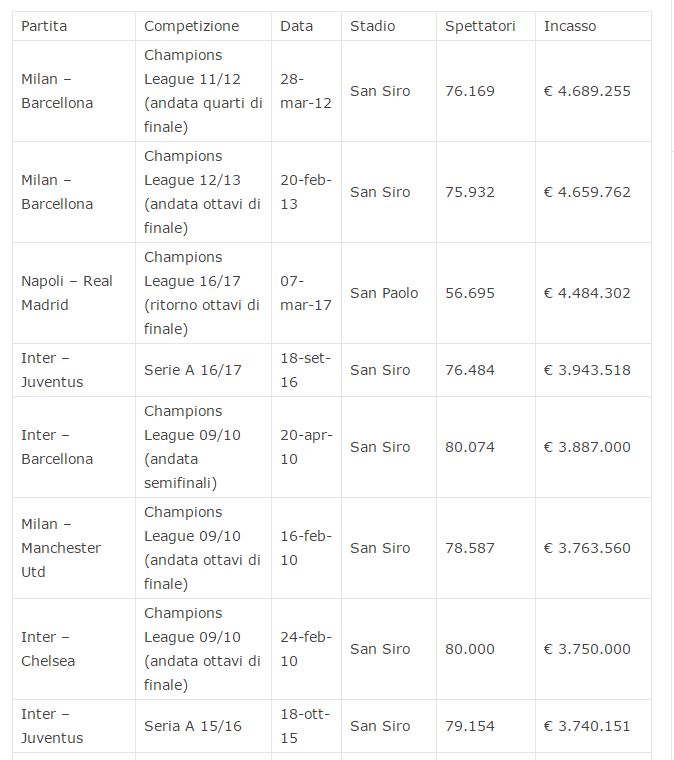 La sfida tra Napoli e Real Madrid si piazza così sul podio del record incassi delle squadre italiane, superata solo da due gare tra Milan e Barcellona nelle edizioni 2011/12 e 2012/13 della Champions League.
