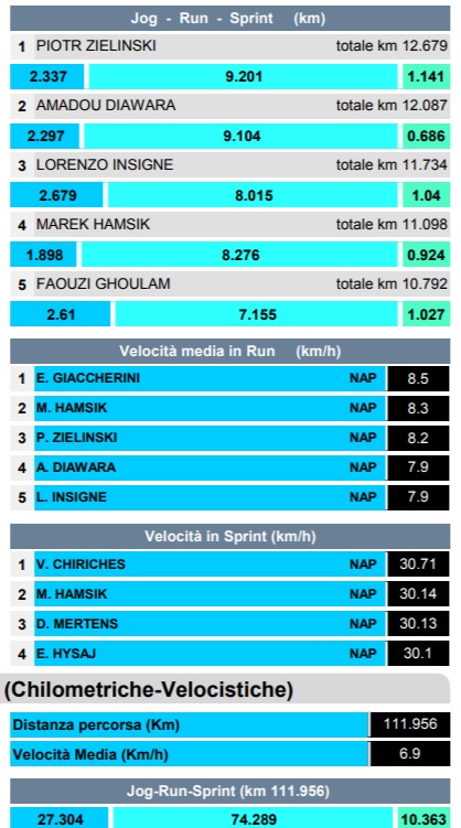 Altro che calo fisico. Il Napoli con 111,956km eguaglia la distanza percorsa dal Genoa di Juric. Nei singoli spicca Zielinski con 12,679km ed a seguir Diawara, Insigne, Hamsik (uscito prima rispetto ai compagni) e Ghoulam.