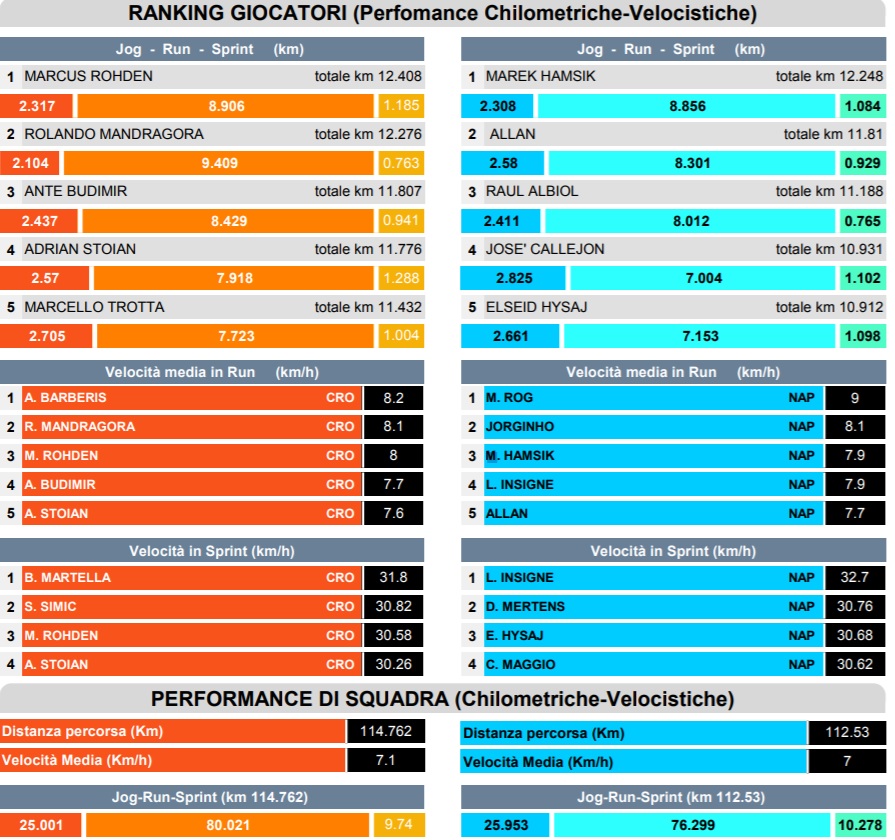 Il Napoli cresce dal punto di vista fisico e ieri a Crotone ha percorso 112,5km contro i 114 del Crotone. Gli azzurri però hanno effettuato una parte maggiore in sprint (10,2km contro 9). Il migliore degli azzurri è stato Hamsik con 12,2km, a seguire Allan, Albiol e Callejon. Di seguito la tabella completa della Lega
