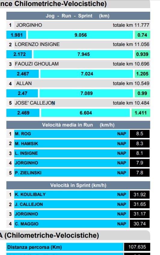 Il Napoli resta stabile intorno ai 107km percorsi anche nell'infrasettimanale con la Lazio, a dimostrazione delle buone condizioni della squadra. Con l'uscita di Hamsik, reduce col Benevento da 12km, per questa partita risulta primo Jorginho con Insigne a seguire, entrambi sopra gli 11km. Di seguito la tabella della Lega Calcio