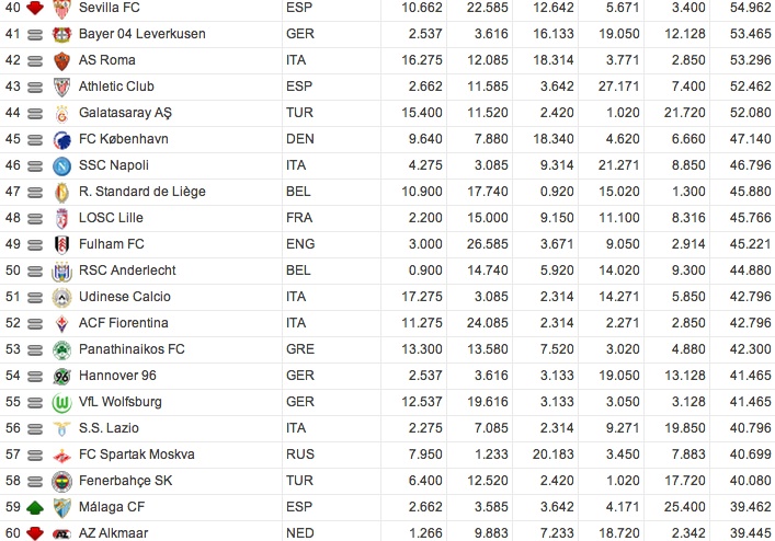 La Uefa ha aggiornato il ranking delle squadre di club. Il Napoli è stabile al 47° posto