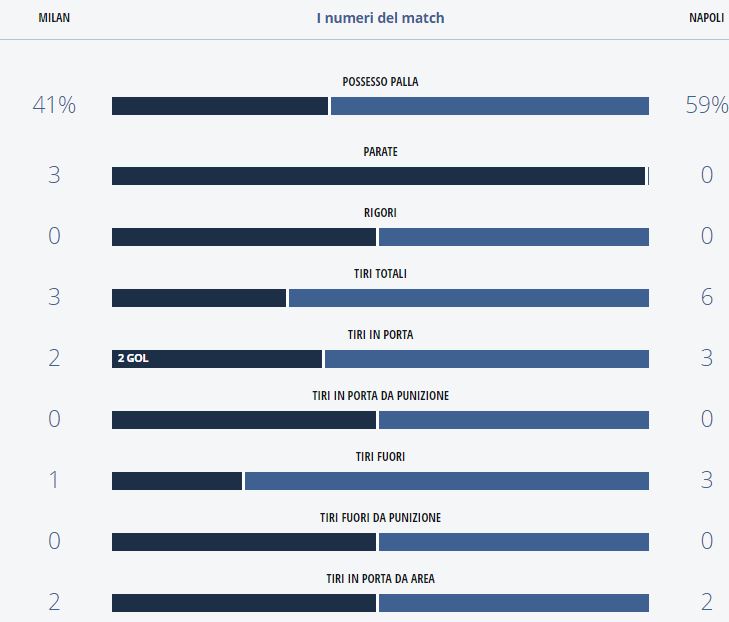 Il Napoli ha il 59% di possesso palla, ha calciatore sei volte in totale in porta, il doppio del Milan, ha tirato perfino più dei rossoneri nello specchio della porta, eppure è sotto 2-0 a San Siro. Rossoneri in vantaggio sulle uniche due palle giocabili in area per Piatek. Di seguito i numeri dopo il primo tempo: