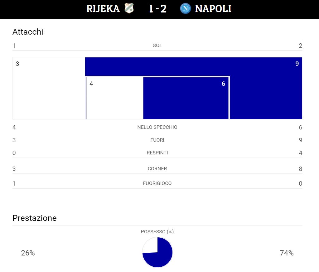 Un Napoli che ha portanto tanto palla, durante la sfida di stasera contro il Rijeka, totalizzando la bellezza del 74% di possesso palla. A mancare nella squadra azzurra è stata l'incisività in fase offensiva: gli azzurri, infatti, hanno collezzionato 6 tiri in porta, soltanto due in più degli avversari. Tanti i corner per gli azzurri (8 contro i 3 avversari) che non hanno sfruttato le occasioni dalla bandierina.
