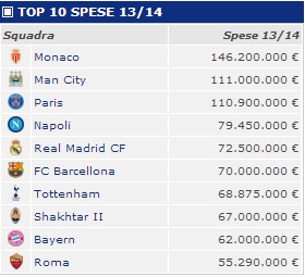 In attesa di classifiche e statistiche riguardanti l'imminente campionato, il Napoli upò consolarsi con un quarto posto nella top10 dei club che hanno speso di più in Europa in questa sessione di mercato estiva. Il club di De Laurentiis finora ha sborsato quasi 80mila di euro, piazzandosi al quarto posto dietro Monaco, City e Psg. Con gli acquisti di Astori, e probabilmente di Matri e Zapata, gli azzurri però potrebbero tentare il sorpasso ai parigini.