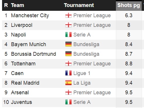 Non solo numeri da favola in attacco, col migliore score europeo. Il Manchester City di Guardiola può vantare anche la miglior fase difensiva d'Europa: i Citizens infatti subiscono meno tiri a partita (la media di 6,3 per gara), davanti al Liverpool ed al Napoli a 8. In questa classifica la Juventus è decima avendo una media di 9.5 tiri concessi a partita. Numeri che non sorprendono considerando che gli inglesi hanno mantenuto la porta inviolata in 8 delle ultime 12 partite e non a caso Sarri parla già dall'andata della miglior squadra d'Europa.