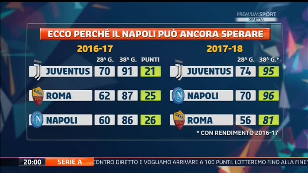 Con l'ausilio di un grafico, la redazione Premium dà speranza al Napoli in vista della vittoria dello scudetto. Nelle ultime dieci giornate dello scorso campionato, infatti, gli azzurri conquistarono 26 punti contro i 21 della Juve. Dovesse accadere anche oggi, il Napoli si ritroverebbe primo a quiota 96 punti con la Juve seconda a 51.
