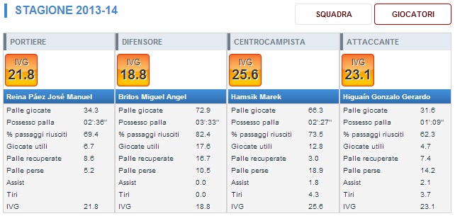 Di seguito vi proponiamo la statistica tratta dal sito della Lega che offre il miglior giocatore per ogni ruolo in base al rating. In difesa a sorpresa c'è Miguel Angel Britos con 82,4% di passaggi riusciti.