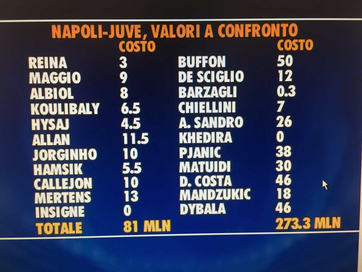 Cosi, a poche ore dal match tra Napoli e Juventus, la sfida comincia a scaldarsi da una parte e dell'altra. Arrivano anche i complimenti di Telelombardia, che evidenzia come il Napoli abbia raggiunto le vette della classifica con una costata quattro volte meno rispetto a quella della Juventus. Di seguito il grafico.