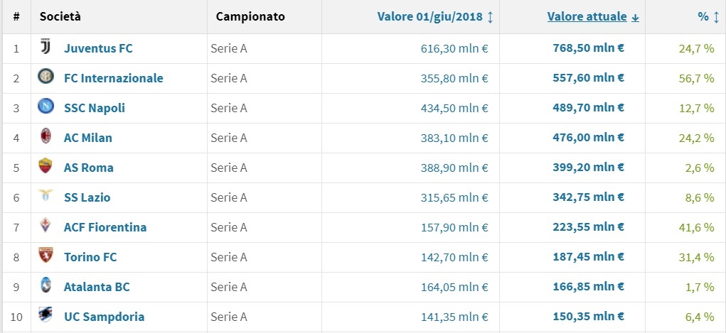 Anche dopo questo mercato estivo - che ha visto colpi importanti messi a segno dalle concorrenti - il Napoli resta la terza rosa per valore della Serie A. Secondo il sito specializzato Transfermarkt la rosa del Napoli al 1 giugno valeva 434mln di euro, dopo il mercato ha un valore di 489mln, in crescita del 12%. Importante la crescita di Juventus e Inter che restano davanti per valore, ed anche quella del Milan (+24%) che però resta dietro il Napoli e e può beneficiare del valore di tanti giocatori in prestito oneroso da riscattare il prossimo anno. Stabile al quinto posto la Roma che a fronte degli acquisti ha perso Nainggolan e Alisson. Il Napoli, va detto, si conferma tra le migliori gestioni perché ha creato una rosa da 489mln a fronte di una spesa acquisti totale di 232mln mentre Roma e Milan, ad esempio, nonostante una spesa di 250mln, sono al di sotto dei partenopei come valore.