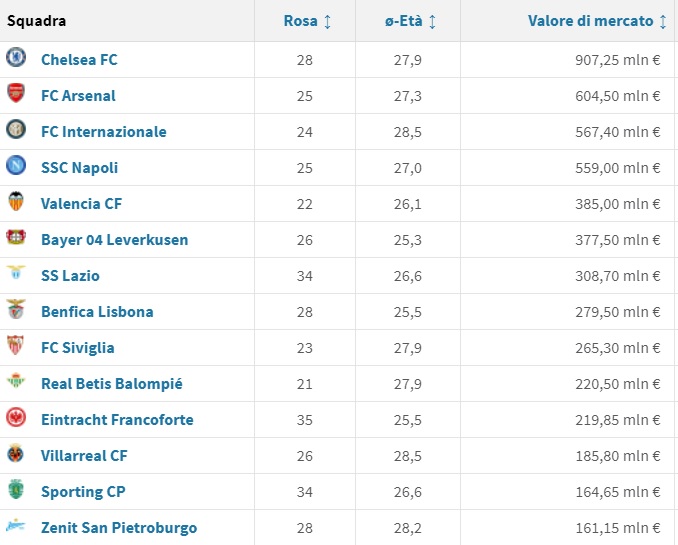 Il Napoli da febbraio avrà come obiettivo l'Europa League e per molti ha le carte in regola per arrivare in fondo. Sarà però in ottima compagnia perché - secondo il sito specializzato Transfermarkt - ci sono almeno tre club che hanno un organico di valore superiore. Il Napoli infatti è quarto per valore rosa con un organico da 559mln, dietro l'Inter con 567mln, l'Arsenal con 604mln e soprattutto il Chelsea che ha una rosa tra quelle di maggiore valore che vale 907mln. Di seguito la graduatoria del sito specializzato Transfermarkt