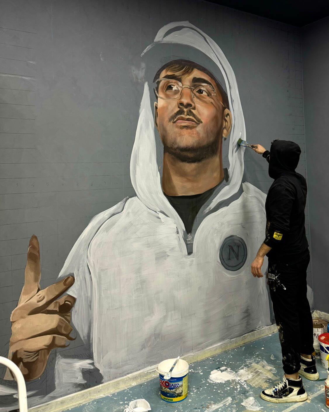 Le immagini sono divenute subito virali e ora sono diventate addirittura un murale. L'autore, Taddeo Del Gaudio, ha dipinto il noto rapper napoletano con la tuta bianca del club partenopeo. Di seguito lo scatto.