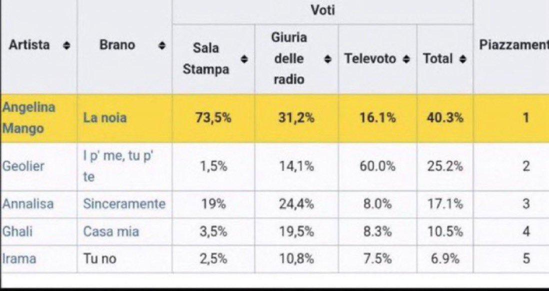 Il risultato finale della classifica Top5, ottenuto con la media dei voti di Sala Stampa, giuria Radio e Televoto, ha incoronato Angelina Mango con il 40,3%. Al secondo posto Geolier con il 25,2%, al terzo Annalisa con il 17,1%, al quarto Ghali con il 10,5% e al quinto Irama con il 6,9%. Ma Geolier aveva sbancato il televoto (nonostante problemi e voti non conteggiati) con il 60%, Angelina Mango seconda con il 16,1% dei voti telefonici. A fare la differenza, come detto, la sala stampa che in maniera univoca (73,5%) ha premiato Mango e lasciato l'1,5% a Geolier. Così è stata ribaltata la volontà popolare.
