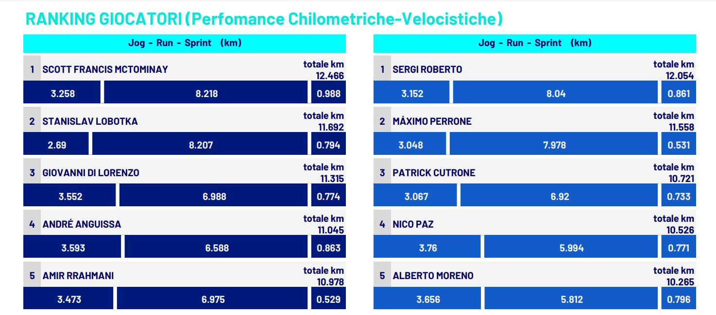 Anche stavolta il centrocampista scozzese dimostra di avere un motore superiore agli altri, da Premier League, facendo meglio di Lobotka, Di Lorenzo e Anguissa, secondi, terzi e quarti azzurri in questa classifica. Di seguito le performance chilometriche nel report statistico pubblicato dalla Lega Serie A.