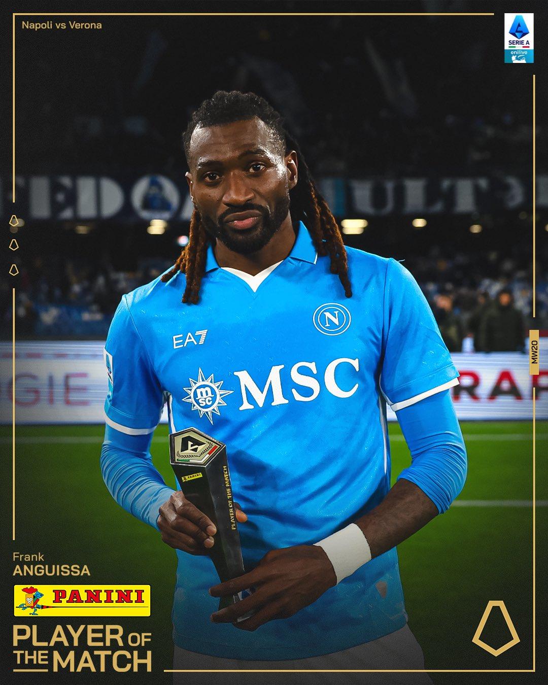 Frank Zambo Anguissa, autore del secondo gol del Napoli che chiude il match vinto dagli azzurri 2-0 contro il Verona, è l'MVP della sfida dello Stadio Maradona. Il centrocampista, autore di un'ottima prestazione, è il migliore in campo per la Lega Serie A e vince per la terza volta in stagione il Panini Player of the Match. Di seguito la foto