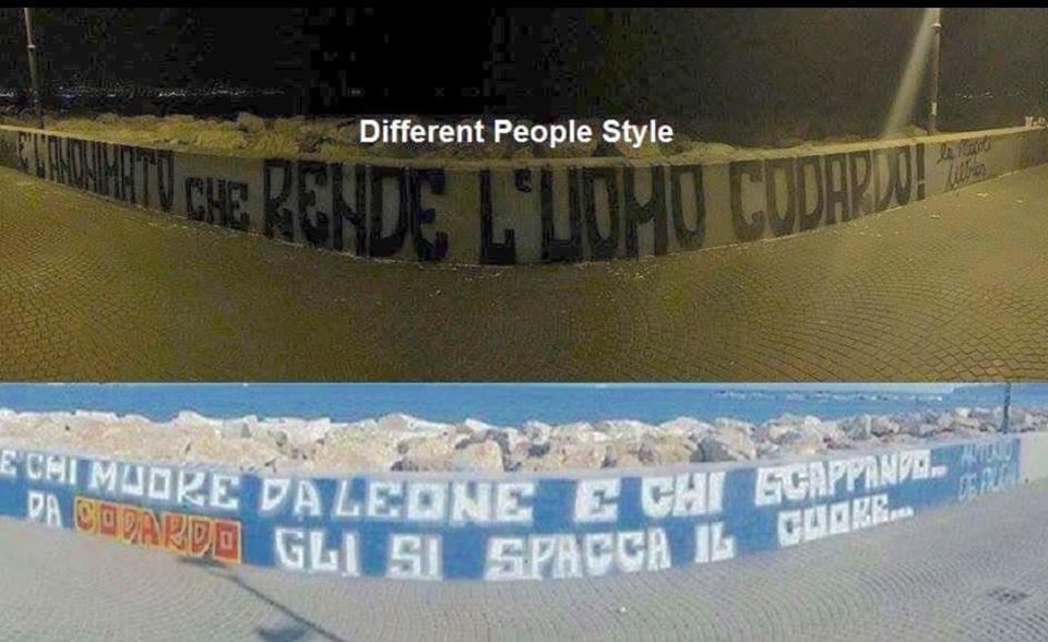 Ci associamo al Grazie di Marco De Falchi fratello di Antonio, ai ragazzi della Curva A di Napoli che hanno provveduto dopo la segnalazione a cancellare quell'orribile scritta