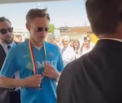 Il Napoli sta per arrivare al molo Luise. I campioni d'Italia sono salpati su un aliscafo dal molo Pisacane e tra poco attraccheranno al molo Luise per poi dirigersi sui due bus scoperti per la parata scudetto. A bordo dell'aliscafo anche il presidente Aurelio De Laurentiis e il sindaco di Napoli Gaetano Manfredi. Di seguito Gilmour e McTominay che salgono sull'imbarcazione, immagine raccolta da Radio Kiss Kiss Napoli.
