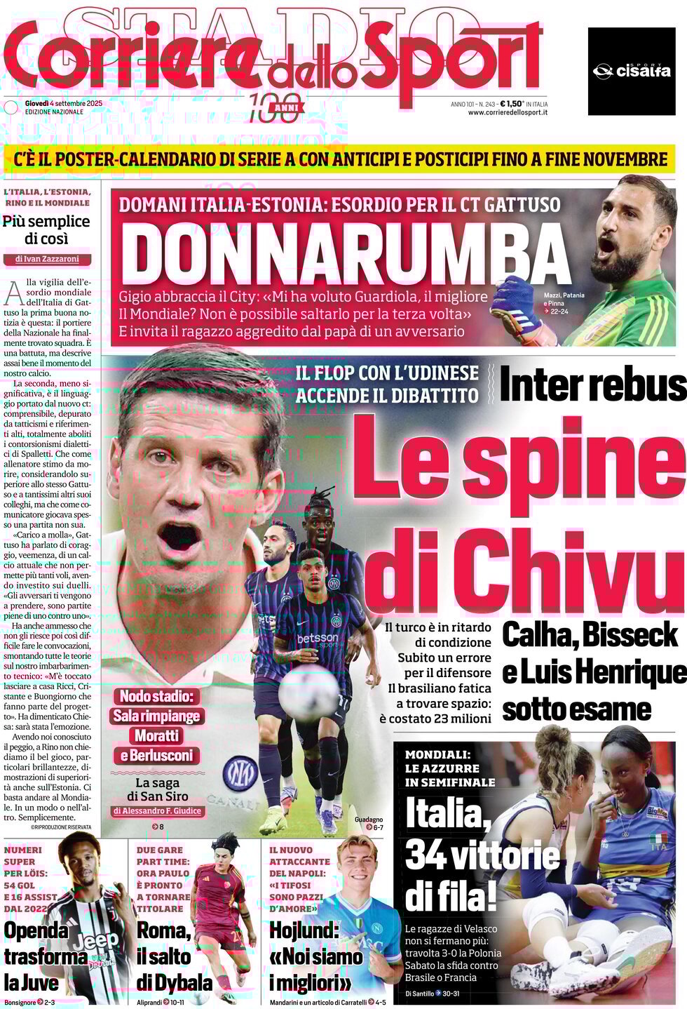 "Le spine di Chivu": questo è il titolo principale della prima pagina di oggi del Corriere dello Sport. Rebus Inter: il flop con l'Udinese accende il dibattito. Calha, Bisseck e Luis Henrique sotto esame. Il turco è in ri tardo di condizione, subito un errore per il difensore e il brasiliano - costato 23 milioni - fatica a trovare spazio.