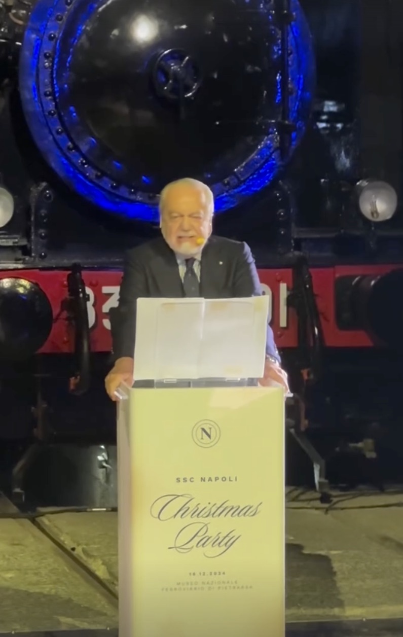 Tutta la SSCNapoli si è riunita al Museo Nazionale Ferroviario di Pietrarsa, in quel di Portici, per il Christmas party, la cena di Natale. Una serata ricca di emozioni, tutta da rivivere attraverso le immagini e i video. L'arrivo sul posto di Aurelio De Laurentiis, Manna e Bianchini, poi Conte con i calciatori, gli outfit eleganti e i sorrisi degli azzurri e infine il discorso bellissimo del presidente. Clicca sui link per riguardare i video, qui sotto la fotogallery