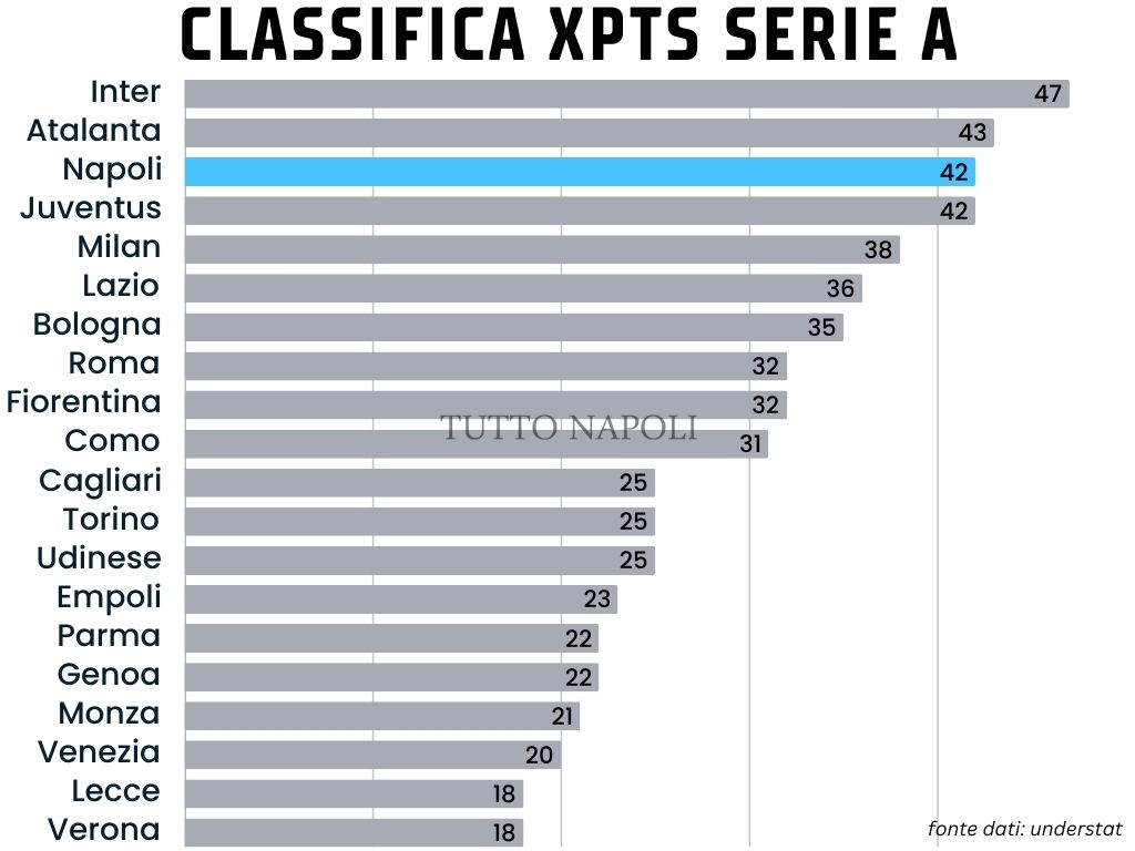Arrivati alla 22esima giornata di Serie A, la classifica vede il Napoli al primo posto con tre punti di vantaggio sull'Inter (con una gara da recuperare), sette sull'Atalanta e altrettanti sulle squadre più in basso come la Juventus che è a indietro di 16 lunghezze. Esiste un altro tipo di classifica, quella dei punti attesi (xPTS, expected points): un tabellone ottenuto dalla simulazione delle partite attraverso parametri come xG (gol attesi) e xGA (gol attesi concessi). L'obiettivo è avere un quadro sulla posizione virtuale delle squadre basato più su prestazioni e "merito".