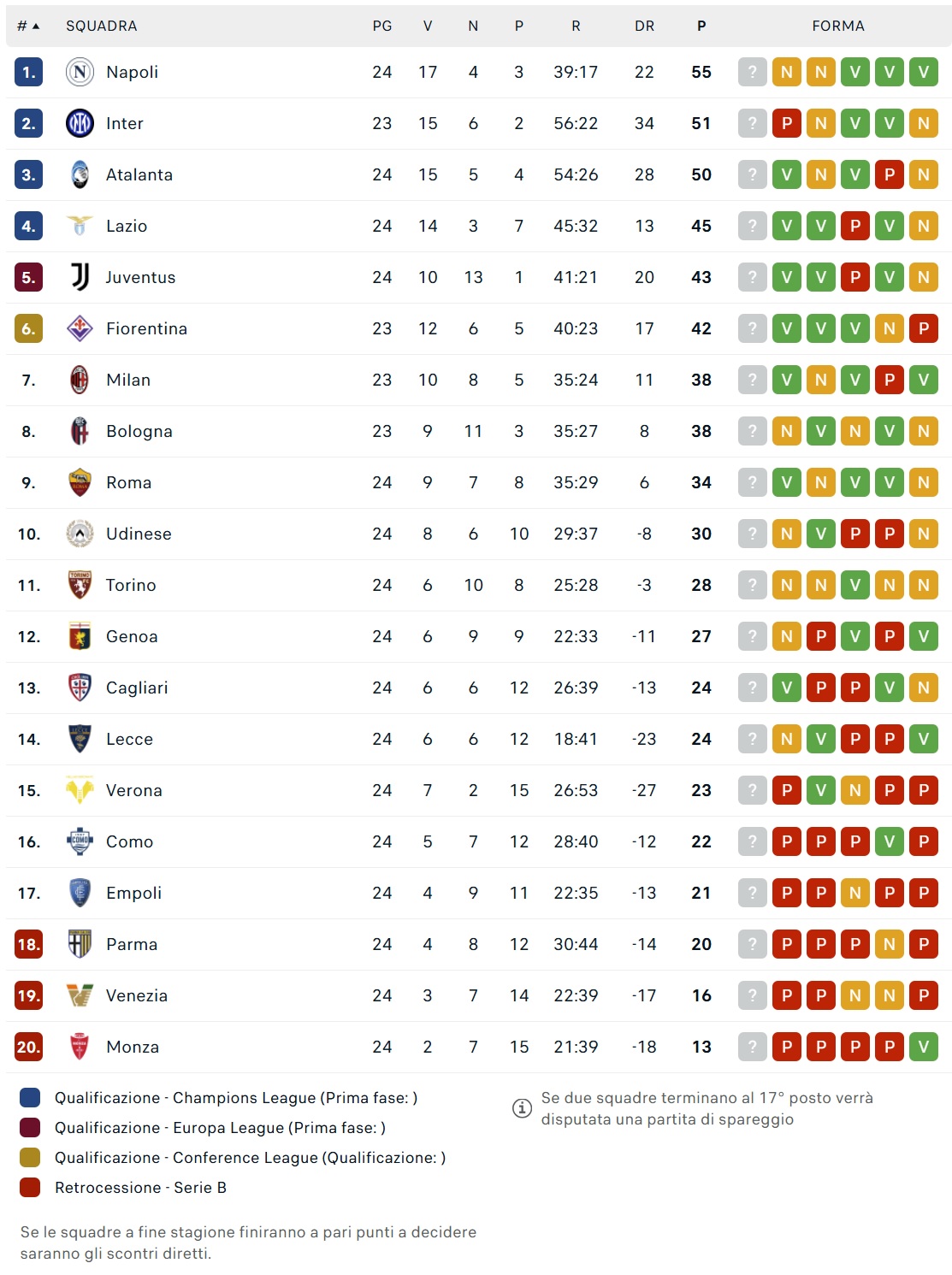 Altro pareggio per il Napoli, il secondo di fila dopo Roma per la capolista, il secondo consecutivo per 1-1. Il Napoli frena nella corsa-Scudetto e non va oltre l'1-1 contro un'ottima Udinese al Maradona. In attesa di Inter-Fiorentina, gli azzurri allungano di un solo punto sulla seconda in classifica, nerazzurri ora a -4. Di seguito la classifica di Serie A aggiornata.