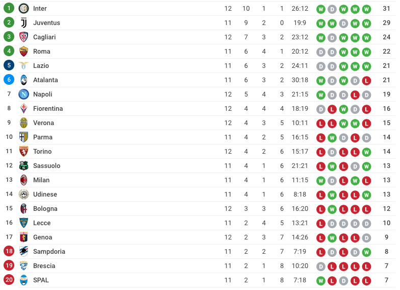 Dopo l'anticipo delle 12.30 tra Cagliari e Fiorentina che ha visto la vittoria dei sardi per 5-2 sui viola, la squadra di Maran, in attesa delle restanti gare si porta momentaneamente al terzo posto in classifica a quota 24 punti. La Fiorentina manca la possibilità di agganciare il Napoli al settimo posto e resta a -3 dagli azzurri a quota 16 punti