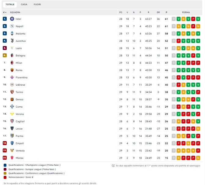 Il Napoli frena a Venezia: solo 0-0 degli azzurri allo Stadio Penzo. Chance sprecata per la squadra di Conte che prima di Atalanta-Inter prende solo un punto e aggancia la squadra di Inzaghi al primo posto in classifica. Di seguito la classifica di Serie A aggiornata.