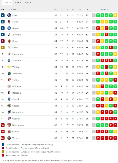 CLASSIFICA - E' notte fonda per il Napoli! Addio al sogno e terzo posto a rischio