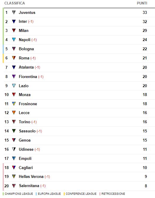 Il Bologna assapora il successo a Lecce, ma viene raggiunto su rigore al 99'. I felsinei falliscono così l'aggancio al quarto posto occupato dal Napoli, con gli azzurri che restano a +2 e stasera potrebbero allungare contro l'Inter. Di seguito la classifica aggiornata.