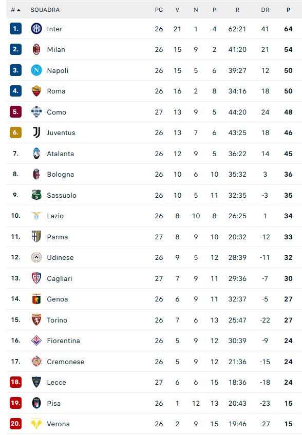 CLASSIFICA - Il Como supera la Juventus e mette pressione a Roma e Napoli