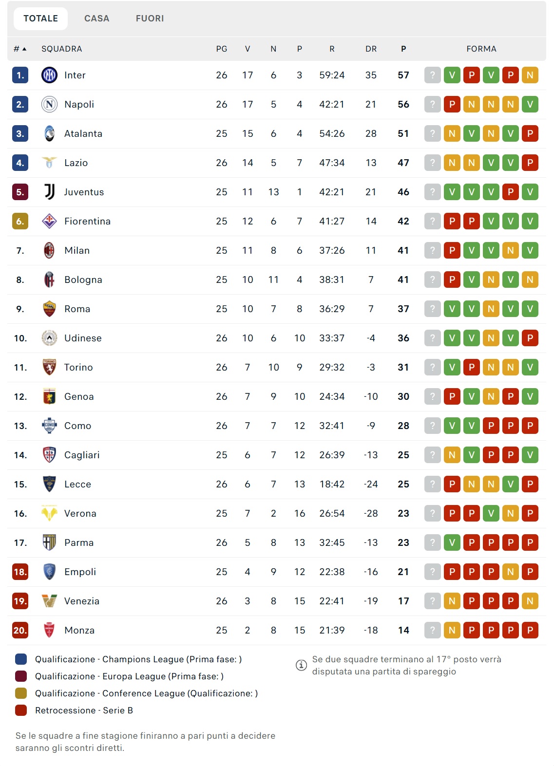 Inter 57 punti (26 partite giocate)