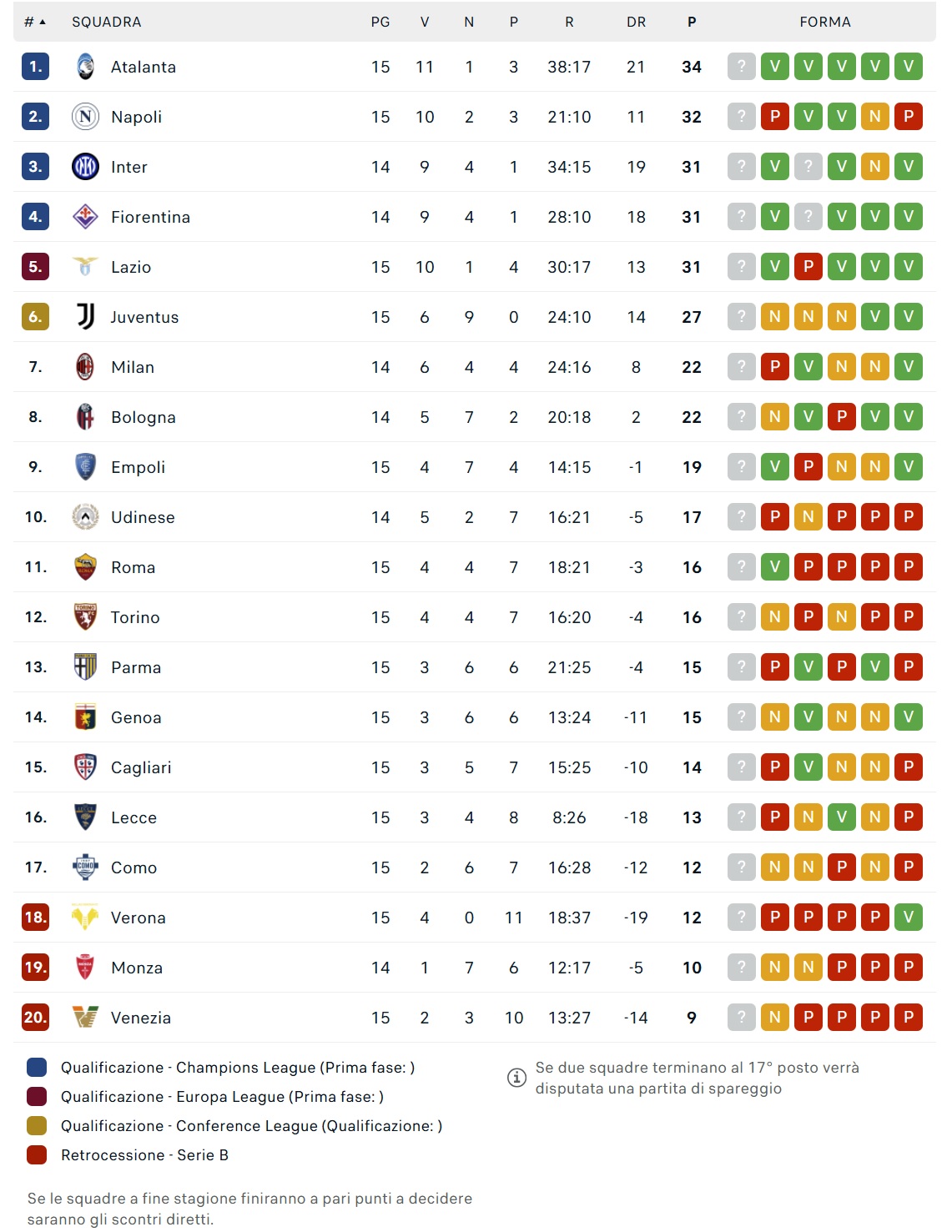 Lazio ancora letale per il Napoli, che dopo la Coppa Italia soccombe anche in campionato contro la squadra di Baroni. Gli azzurri perdono anche la testa della classifica, l'Atalanta resta prima con due punti di vantaggio. Di seguito la classifica aggiornata.