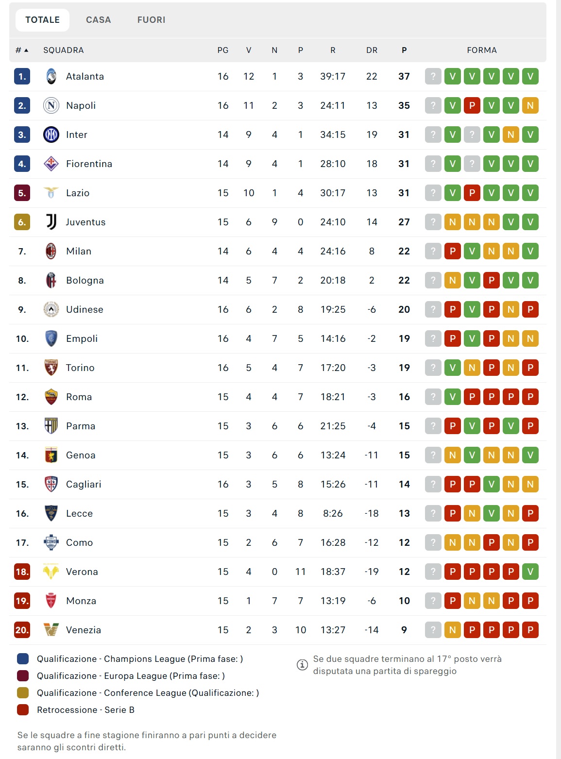 Il Napoli risponde alla vittoria della capolista Atalanta. Gli uomini di Antonio Conte battono l'Udinese 3-1 in rimonta al Bluenergy Stadium e restano in scia dei bergamaschi: -2 punti. Di seguito la classifica aggiornata.